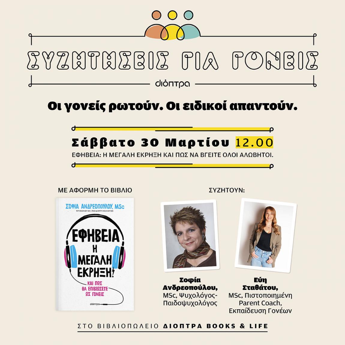 Με αφορμή το βιβλίο Εφηβεία: Η μεγάλη έκρηξη! συζητούν οι: Σοφία Ανδρεοπούλου, MSc, Ψυχολόγος-Παιδοψυχολόγος & Εύη Σταθάτου, MSc, Πιστοποιημένη ParentCoach, Εκπαίδευση Γονέων