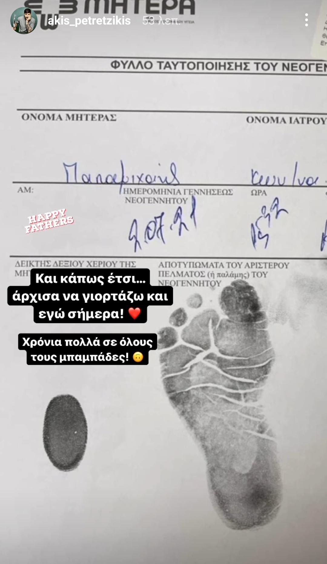 Ο πετυχημένος chef γιόρτασε για πρώτη φορά φέτος τον ρόλο του ως μπαμπάς, δημοσιεύοντας το φύλλο ταυτοποίησης του νεογέννητου γιου του, Αχιλλέα, ο οποίος ήρθε στη ζωή τον περασμένο Ιούλιο. «Και κάπως έτσι... άρχισα να γιορτάζω κι εγώ σήμερα!», έγραψε χαρακτηριστικά.
