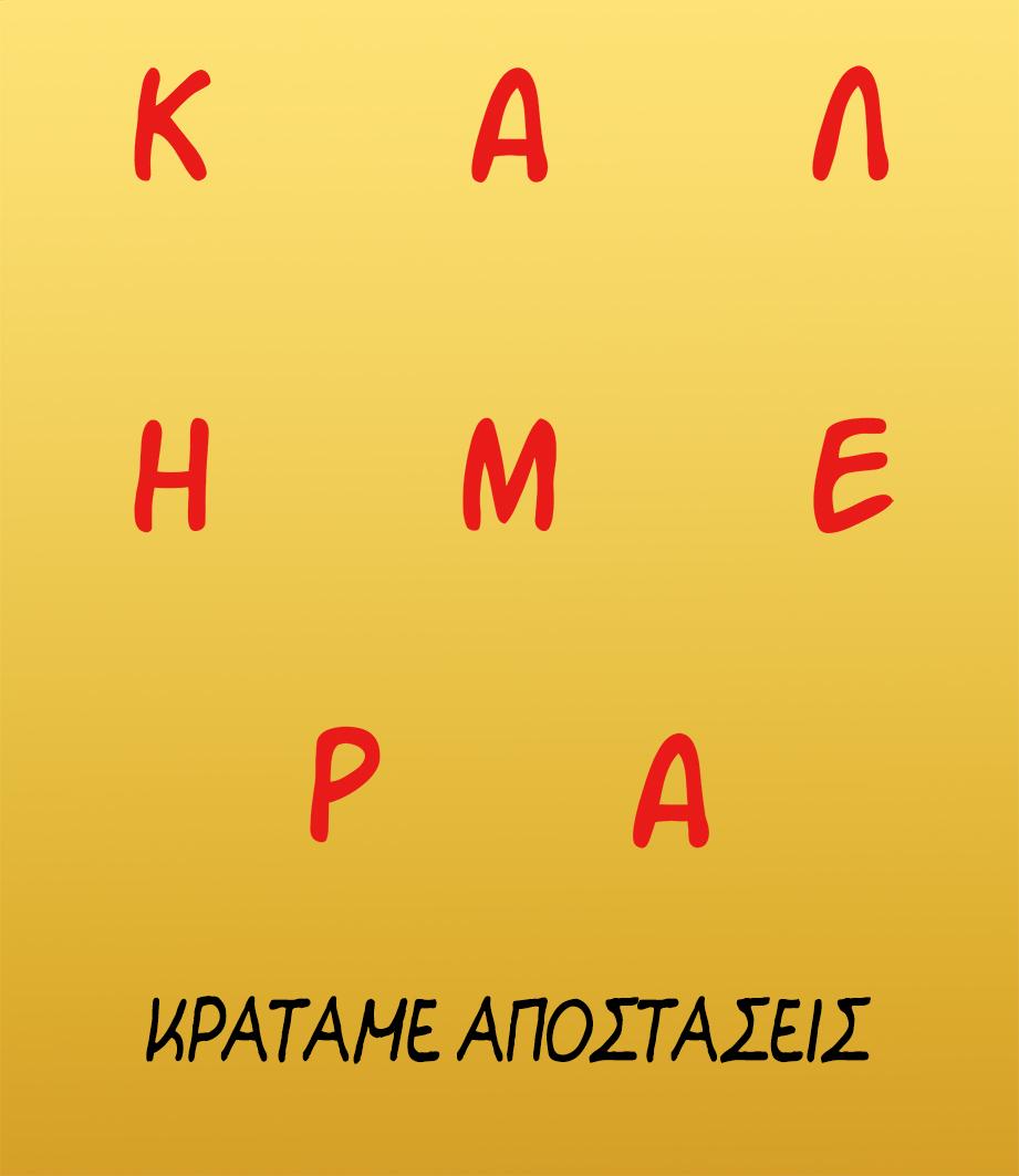 Στο σκίτσο, ο μικρός Θανασάκης φοράει τη μάσκα του και λέει "Θέλω τη γιαγιά μου ζωντανή κι ας μου χαλάει τη φράντζα!".