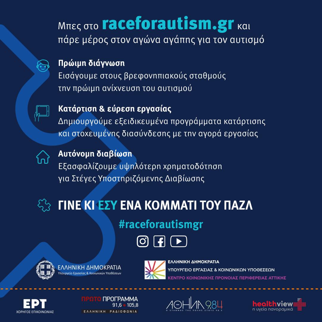 Με αφορμή την Παγκόσμια Ημέρα για τον Αυτισμό, το Κέντρο Κοινωνικής Πρόνοιας Περιφέρειας Αττικής σε συνεργασία με το Υπουργείο Εργασίας και Κοινωνικών Υποθέσεων, διοργανώνουν τον διαδικτυακό αγώνα Race for Autism (#raceforautismgr).
