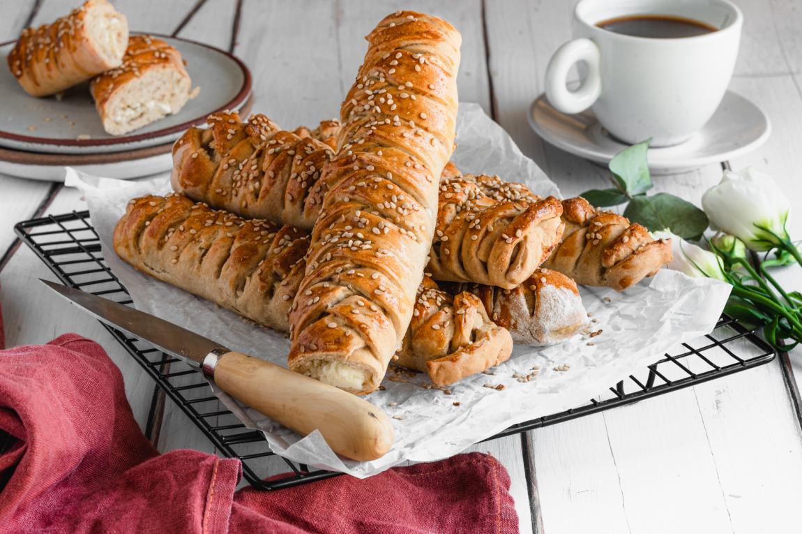 - Τοποθετούμε τις πλεξούδες σε ένα ταψί στρωμένο με αντικολλητικό χαρτί ψησίματος. Ψήνουμε σε προθερμασμένο φούρνο στον αέρα, στους 180°C, για 30 λεπτά.