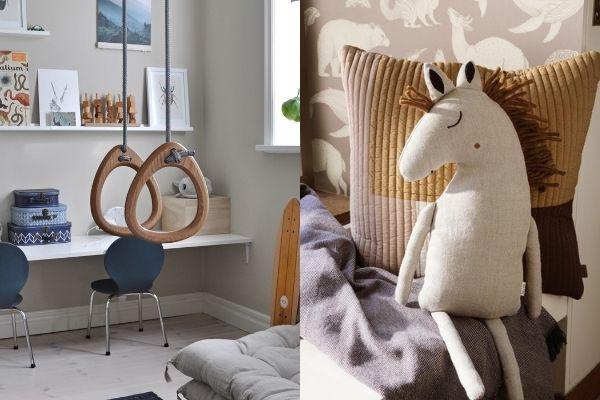 Χειροποίητοι ξύλινοι κρίκοι γυμναστικής σκανδιναβικού design σε μπεζ απόχρωση & Μαξιλάρι σαφάρι αλογάκι, FermLiving | Mini Fee | www.minifee-shop.com