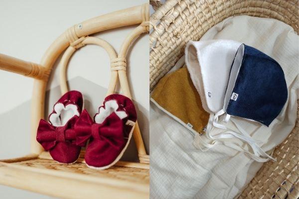 Χειροποίητα παπουτσάκια αγκαλιάς από 100% βαμβακερό ύφασμα με φλις επένδυση και αντιολισθητικό πάτο & Vintage χειροποίητα σκουφάκια bonnet από 100% βαμβακερό κοτλέ ύφασμα με φλις επένδυση που αγκαλιάζει ζεστά το κεφάλι του μωρού | Peekabu | www.peekabu.gr