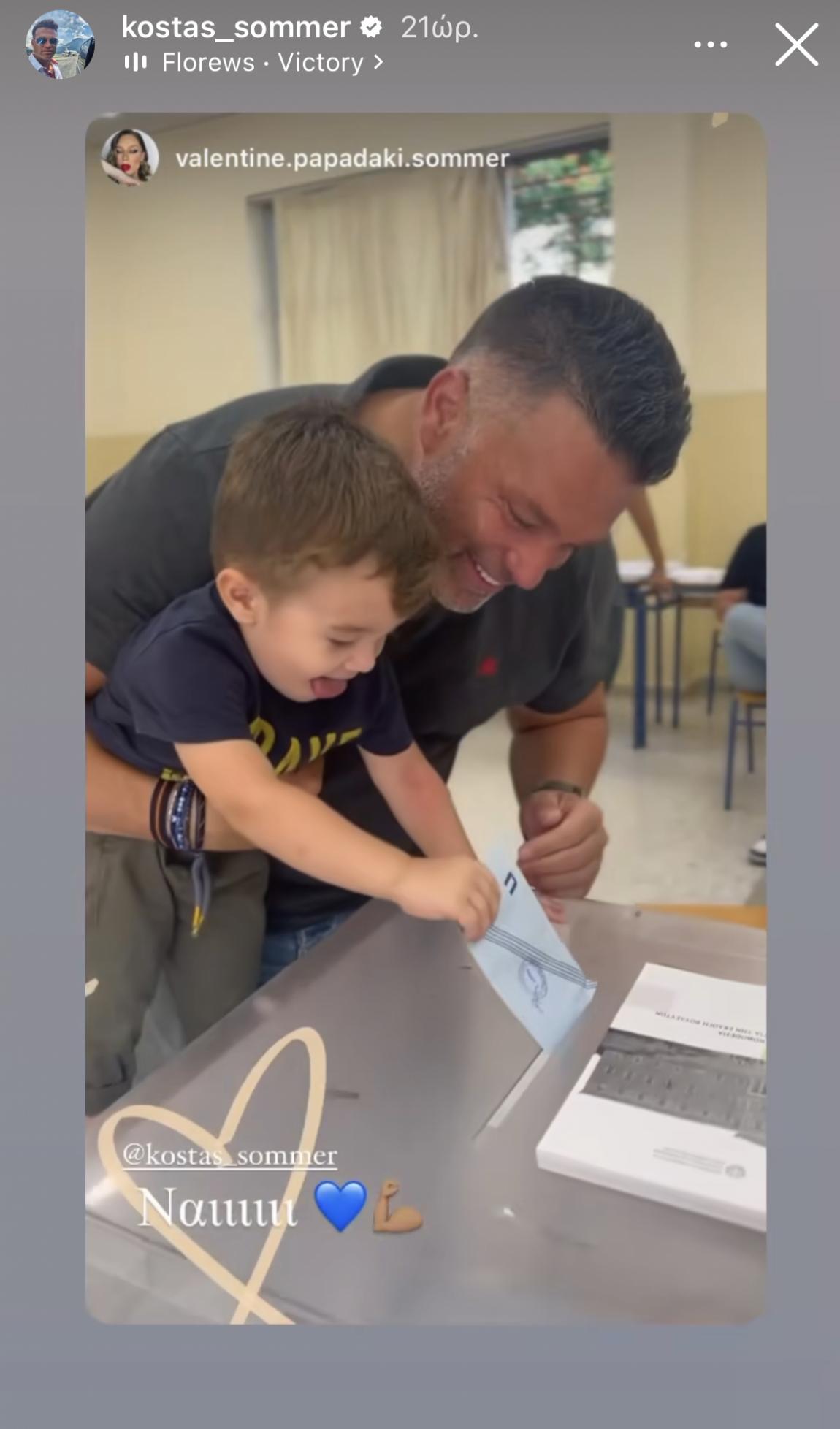 Ο περήφανος μπαμπάς και υποψήφιος περιφερειακός σύμβουλος στον Νότιο Τομέα Αθηνών, Κώστας Σόμμερ, έφτασε στο εκλογικό τμήμα μαζί με τον γιο του Ιάσονα, και η σύζυγός του Βαλεντίνη Παπαδάκη θέλησε να καταγράψει τη στιγμή σε ένα χαριτωμένο στιγμιότυπο που δημοσίευσε στον προσωπικό της λογαριασμό στο Instagram.