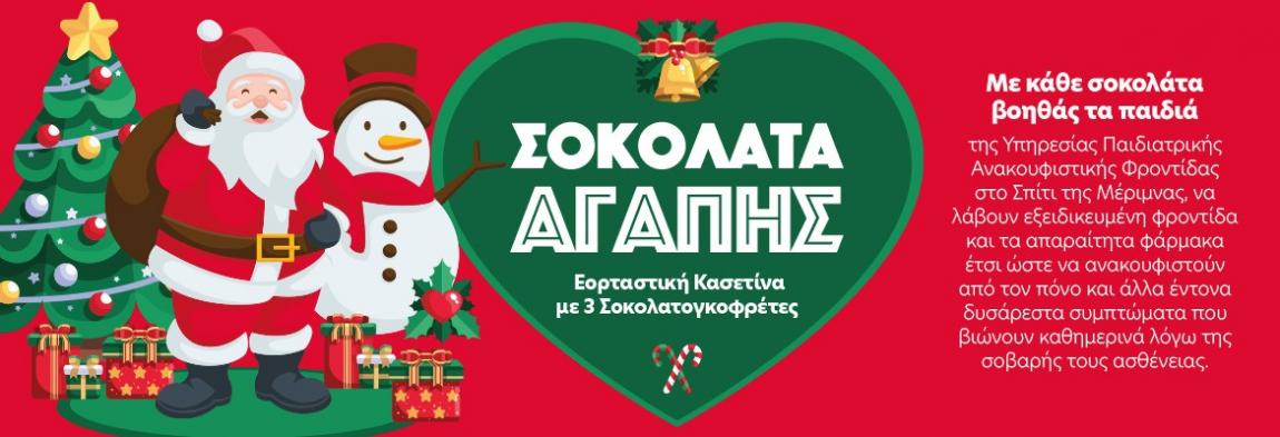 Η Σοκολάτα Αγάπης είναι μία Χριστουγεννιάτικη Κασετίνα με τρεις -εξαιρετικής ποιότητας με πραγματική σοκολάτα- σοκολατογκοφρέτες, των 65gr η κάθε μία, της Σοκολατοβιομηχανίας Oscar. Στο πίσω μέρος της κασετίνας έχει σχεδιαστεί ειδικός χώρος για να γράφετε τις ευχές σας. Από κάθε αγορά σας, προσφέρονται 20 Λ στη Μέριμνα και στη μοναδική στην Ελλάδα Υπηρεσία Παιδιατρικής Ανακουφιστικής Φροντίδας στο Σπίτι.