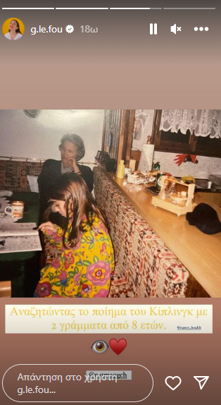 Η Τζωρτζίνα Λιώση μοιράστηκε με τους followers της σε IG Story μια φωτογραφία από την παιδική της ηλικία, στην οποία τη βλέπουμε να λύνει σταυρόλεξο, γράφοντας στη λεζάντα: «Αναζητώντας το ποίημα του Κίπλινγκ με 2 γράμματα από 8 ετών».