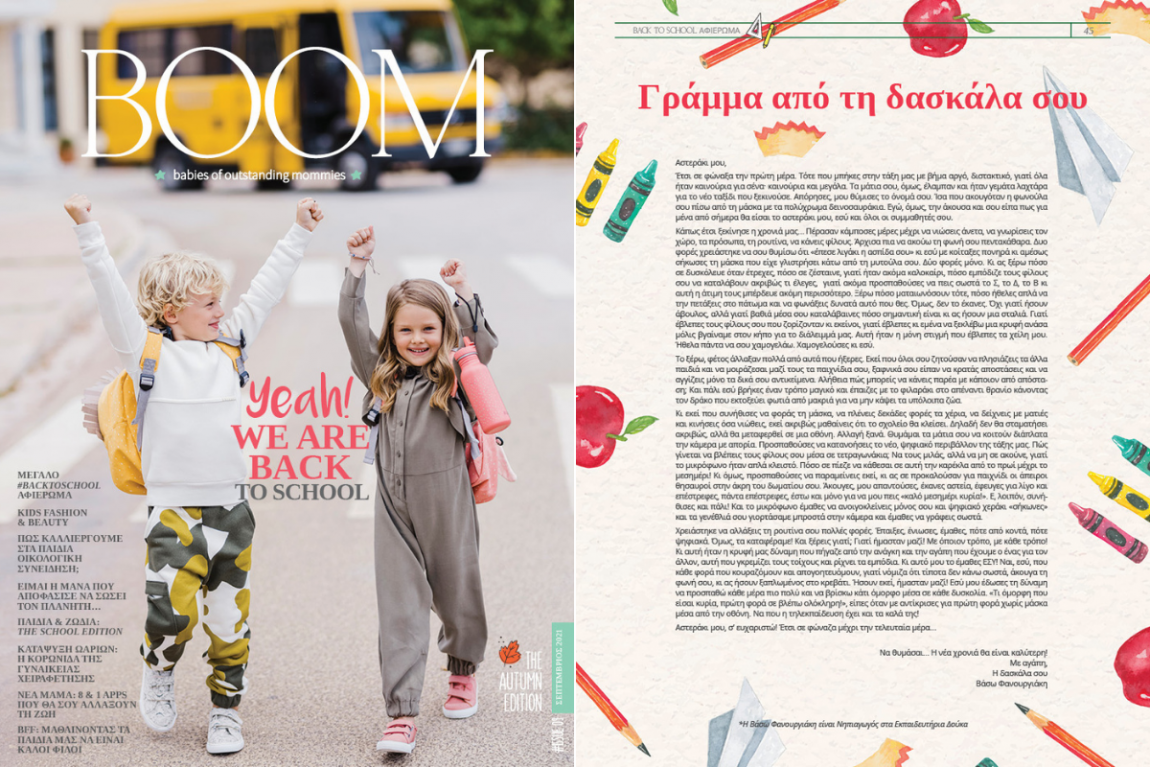 Χρειάστηκε να αλλάξεις τη ρουτίνα σου πολλές φορές. Έπαιξες, ένιωσες, έμαθες, πότε από κοντά, πότε ψηφιακά. Όμως, τα καταφέραμε! Και ξέρεις γιατί; Γιατί ήμασταν μαζί! Με όποιον τρόπο, με κάθε τρόπο! Κι αυτή ήταν η κρυφή μας δύναμη που πήγαζε από την ανάγκη και την αγάπη που έχουμε ο ένας για τον άλλον, αυτή που γκρεμίζει τους τοίχους και ρίχνει τα εμπόδια. Κι αυτό μου το έμαθες ΕΣΥ! Ναι, εσύ, που κάθε φορά που κουραζόμουν και απογοητευόμουν, γιατί νόμιζα ότι τίποτα δεν κάνω σωστά, άκουγα τη φωνή σου, κι ας ήσουν ξαπλωμένος στο κρεβάτι. Ήσουν εκεί, ήμασταν μαζί! Εσύ μου έδωσες τη δύναμη να προσπαθώ κάθε μέρα πιο πολύ και να βρίσκω κάτι όμορφο μέσα σε κάθε δυσκολία. «Τι όμορφη που είσαι κυρία, πρώτη φορά σε βλέπω ολόκληρη!», είπες όταν με αντίκρισες για πρώτη φορά χωρίς μάσκα μέσα από την οθόνη. Να που η τηλεκπαίδευση έχει και τα καλά της!