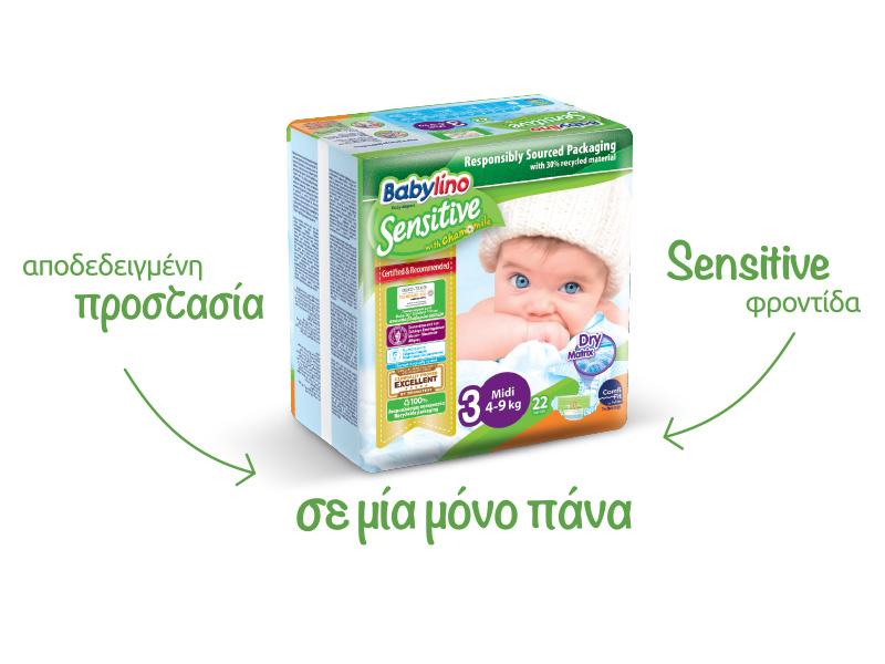 Το δερματάκι του μωρού μας είναι πολύ πιο ευαίσθητο αλλά και διαφορετικό από το δικό μας. Καθώς συνεχίζει να ωριμάζει στη διάρκεια των πρώτων χρόνων της ζωής του, χρειάζεται αποδεδειγμένα Sensitive φροντίδα. Πολύτιμος σύμμαχός μας στην προστασία του ευαίσθητου βρεφικού δέρματος είναι οι πάνες Babylino Sensitive, που ονομάζονται έτσι ακριβώς, γιατί είναι φτιαγμένες από προσεκτικά επιλεγμένα υλικά, που δεν είναι απλά απαλά, αλλά ελεγμένα φιλικά προς το δέρμα με τα πιο αυστηρά κριτήρια (category I, Oeko-Tex Certification www.oeko-tex.com), ώστε να καλύπτουν τις ανάγκες του ευαίσθητου βρεφικού δέρματος. Και όλα αυτά με αποδείξεις: