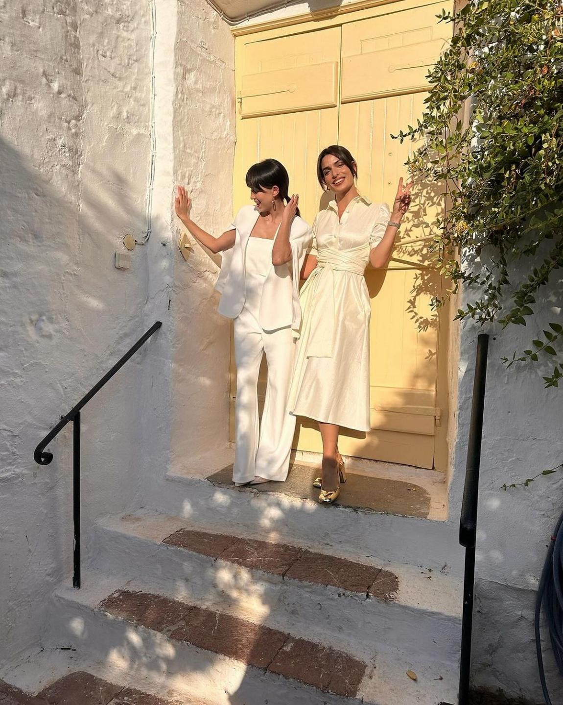 Η έτερη νονά του μικρού Κίμωνα «ψήφισε» το ανδρόγυνο look και φόρεσε ένα ultra stylish off-white κοστούμι με κάπα -και όχι με σακάκι-, επιλέγοντας όμως να κάνει τη διαφορά και να μη συνδυάσει το outfit της με χρυσά παπούτσια, όπως έκαναν η Τόνια και η Χριστίνα.
