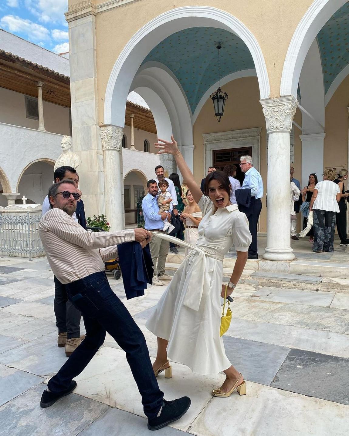 Η 36χρονη ηθοποιός έλαμψε μέσα στο off-white, wrap dress της, το οποίο έχει την υπογραφή του σχεδιαστικού διδύμου Mi-Ro, ενώ ολοκλήρωσε το godmother look με χρυσά κοσμήματα και statement gold sling back γόβες, από τον οίκο Prada.