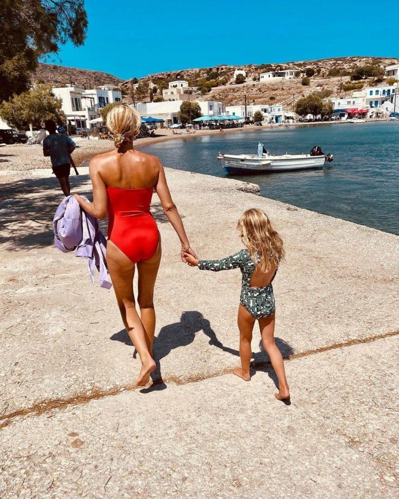 Το διάσημο μοντέλο απολαμβάνει τα καταγάλανα νερά του Αιγαίου και την χαρακτηριστική ομορφιά των Κυκλάδων. Από το πλάι της δεν λείπουν τα παιδιά της, με τα οποία κάνει βουτιές, εξερευνεί τον βυθό με μάσκα και ποζάρει με τις τέλειες αναλογίες και το κόκκινο μαγιό της...