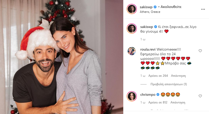 Την ίδια ημέρα, 10 Δεκεμβρίου, ο Σάκης Τανιμανίδης μοιράστηκε μια εξίσου γλυκιά φωτογραφία με ίδιο concept και διαφορετική πόζα, γράφοντας στο caption: "Κι έτσι ξαφνικά... θα γίνουμε 4!". Μαρτυρώντας ότι η αγαπημένη του σύζυγος είναι έγκυος σε δίδυμα!