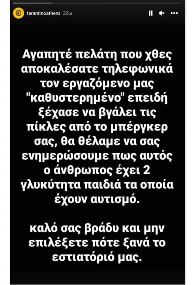 «Αγαπητέ πελάτη που χτες αποκαλέσατε τηλεφωνικά τον εργαζόμενό μας “καθυστερημένο” επειδή ξέχασε να βγάλει τις πίκλες από το μπέργκερ σας, θα θέλαμε να σας ενημερώσουμε πως αυτός ο άνθρωπος έχει 2 γλυκύτατα παιδιά που έχουν αυτισμό. Καλό σας βράδυ και μην επιλέξετε ποτέ ξανά το εστιατόριό μας».