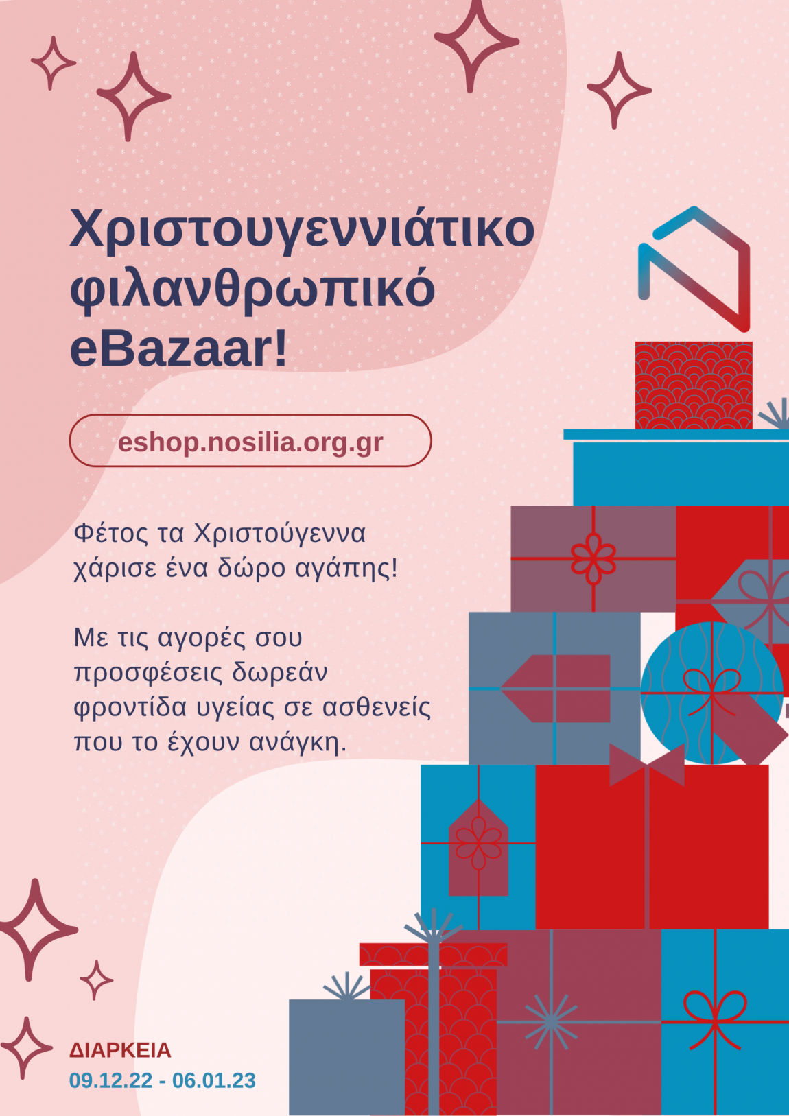 Επισκεφτείτε σήμερα το https://eshop.nosilia.org.gr και πραγματοποιείστε τις αγορές των χριστουγεννιάτικων δώρων. Κάθε προσφορά μικρή ή μεγάλη, είναι πολύτιμη, γιατί με κάθε αγορά στηρίζετε ασθενείς που το έχουν ανάγκη.