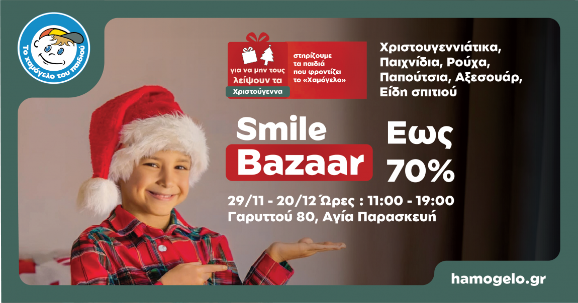 Το Χριστουγεννιάτικο Smile Bazaar από «Το Χαμόγελο του Παιδιού», διοργανώνεται και φέτος από 29 Νοεμβρίου έως 20 Δεκεμβρίου 2024, και σας περιμένουμε στους χώρους του Οργανισμού στην Αγία Παρασκευή, Γαρυττού 80, 5ος όροφος (πλησίον μετρό Αγ. Παρασκευής). Είσοδος ελεύθερη.