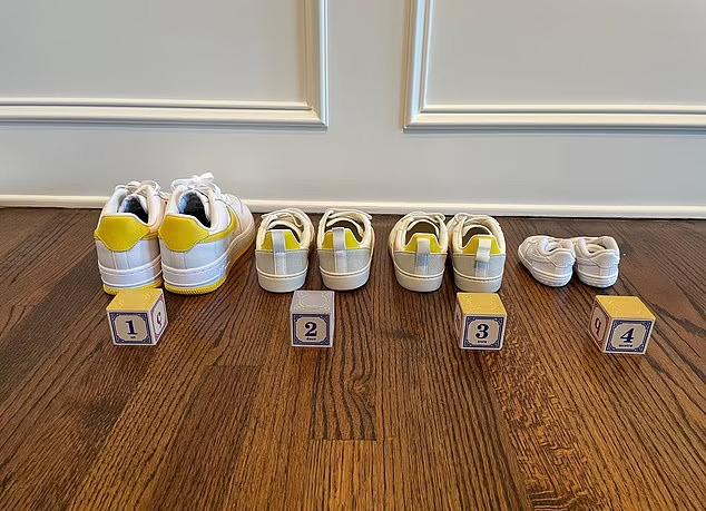 Σε μια άλλη λήψη, η Kerr φωτογραφίζει τέσσερα ζευγάρια παπούτσια που δείχνουν σε ποιο από τα παιδιά της ανήκουν, με ένα πιο μικροσκοπικό ζευγάρι να είναι τοποθετημένο τελευταίο στη σειρά.