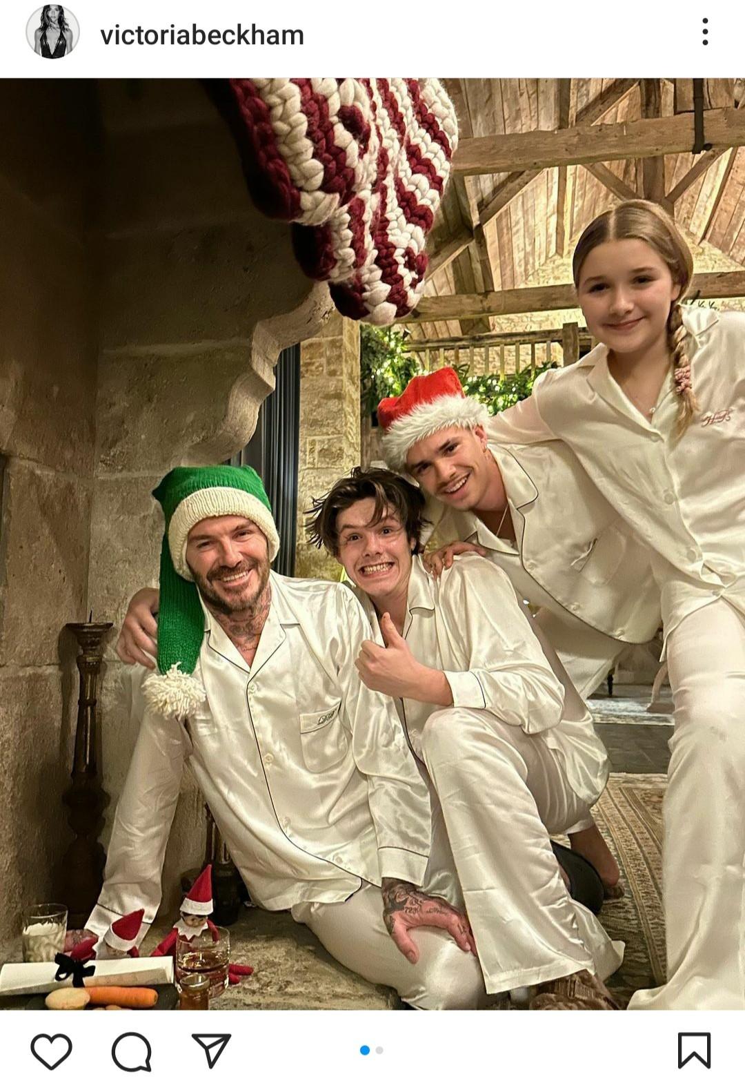 Λευκές πιτζάμες, σκούφοι του Άγιου Βασίλη και... φύγαμε! Η σχεδιάστρια μόδας απαθανατίζει τον σύζυγό της και πρωταγωνιστή του ντοκιμαντέρ Beckham μαζί με τα παιδιά τους στο πιο cozy χριστουγεννιάτικο στιγμιότυπο.