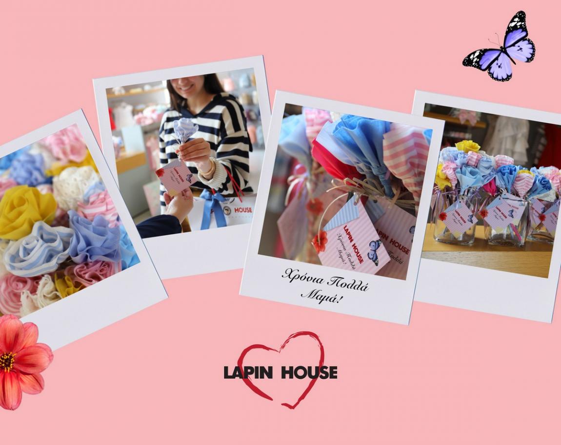Φέτος, η Lapin House θέλοντας να γιορτάσει μια από τις ομορφότερες γιορτές του χρόνου, με τη βοήθεια της σχεδιαστικής ομάδας της έφτιαξε με πάρα πολλή αγάπη 1000 χειροποίητα λουλούδια, χρησιμοποιώντας μοναδικά υφάσματα προηγούμενων συλλογών. Τα υφασμάτινα αυτά λουλούδια μοιράστηκαν σε όλες τις μάνουλες, ενώ έκρυβαν μέσα τους δημιουργία, συναίσθημα και τρυφερότητα φτιαγμένα από μαμάδες για μαμάδες.