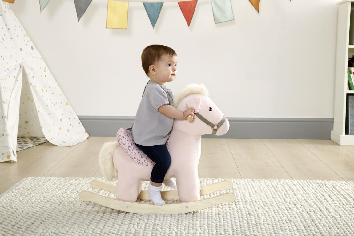 Τη Belle, το κουνιστό ροζ αλογάκι, με το υπέροχο floral print ύφασμα στο κάθισμά του, και αυτάκι που κουδουνίζει και κάνει απαλούς ήχους.