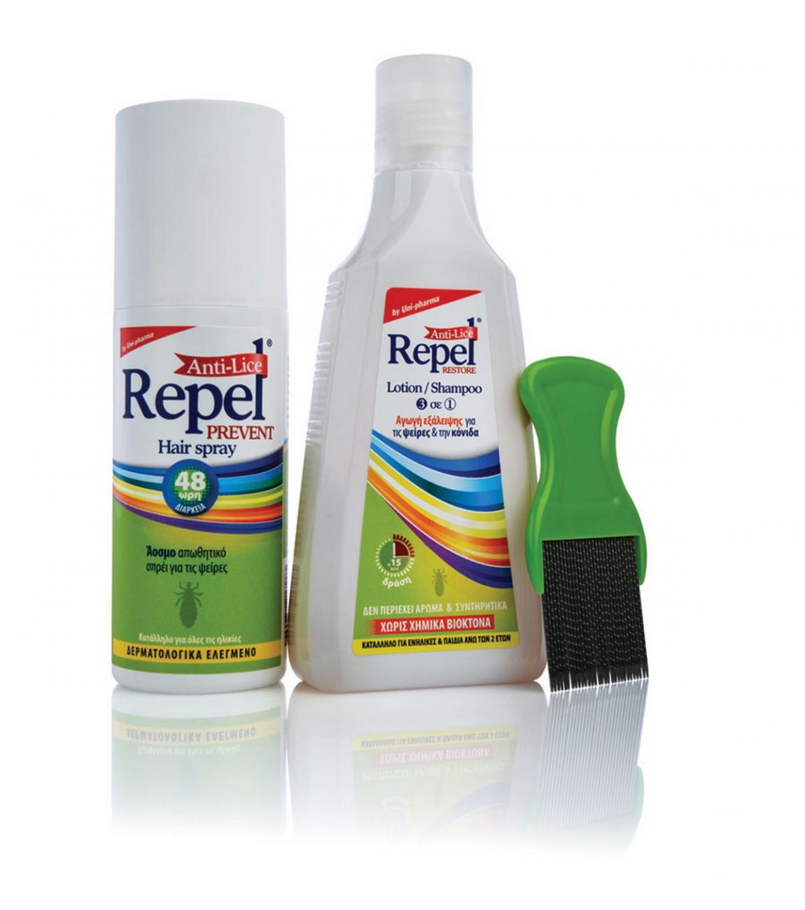 Το Repel® Anti-lice Restore 3 σε 1, που αποτελείται από Lotion/Shampoo και ειδικά σχεδιασμένο χτενάκι, καταπολεμά αποτελεσματικά ψείρες και κόνιδες μέσα σε 15 λεπτά, με μία μόνο εφαρμογή. Αφήνει τα μαλλιά καθαρά κι ευκολοχτένιστα μετά από απλό ξέβγαλμα. Δεν περιέχει χημικά βιοκτόνα, αρώματα και συντηρητικά.