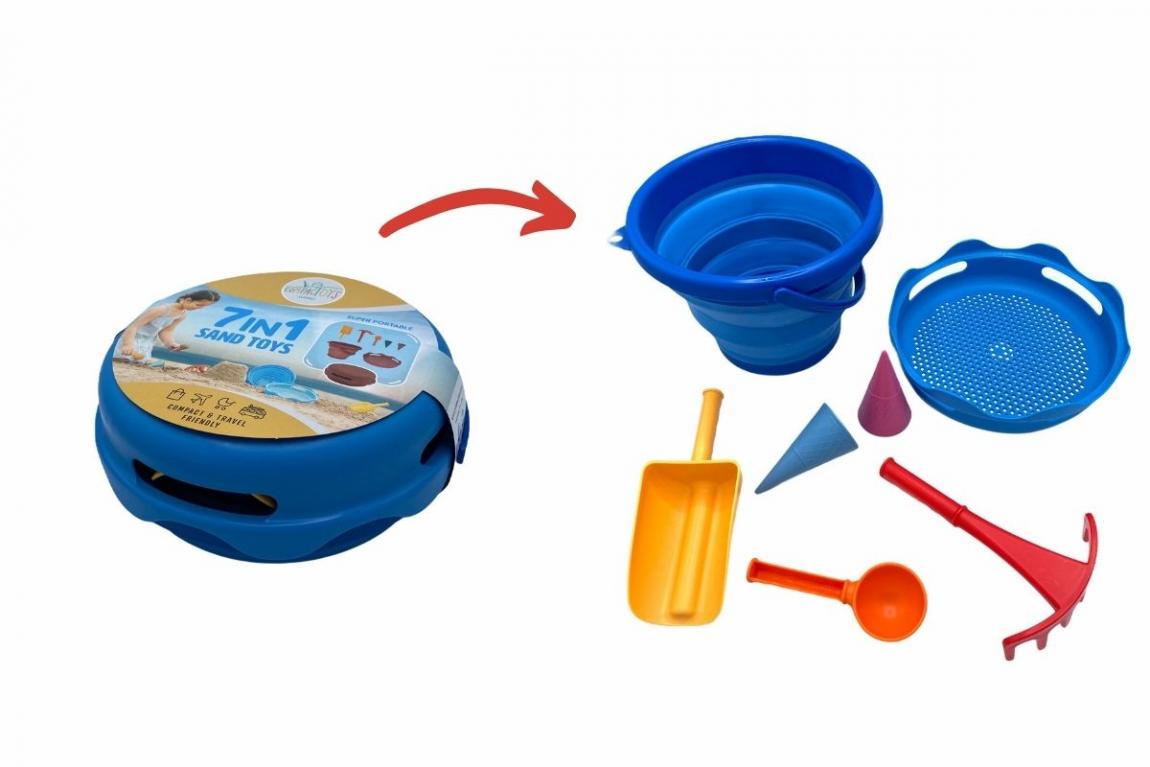Προσοχή, δεν πρόκειται για ένα απλό κουβαδάκι παραλίας: Όχι μόνο είναι πτυσσόμενο και μπαίνει στην τσάντα, αλλά χωράει κι ακόμα 6 παιχνίδια παραλίας!