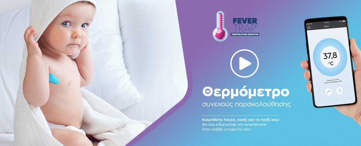 Το Fever Trap™ δεν είναι ένα απλό θερμόμετρο! Είναι ένα θερμόμετρο νέας γενιάς με την επιστημονική υπογραφή της INTERMED και των παραγωγών του ALGOFREN που μετράει κάθε δευτερόλεπτο τη θερμοκρασία του παιδιού σας -ενώ εσείς μπορείτε και να κοιμάστε- και σας ειδοποιεί όταν η θερμοκρασία ξεπεράσει τους βαθμούς που εσείς έχετε ορίσει. Είναι το πρώτο παγκοσμίως θερμόμετρο σε patch, κλινικής ακρίβειας, που παρακολουθεί συνεχώς τη θερμοκρασία του μωρού σας σε πραγματικό χρόνο και στέλνει με ασφάλεια ασύρματα τις πληροφορίες στο smartphone ή το tablet και σας ειδοποιεί αμέσως. Με απλά λόγια, μπορείτε να είστε ήσυχοι πως κανένα ανέβασμα θερμοκρασίας του μωρού σας δεν θα σας ξεφύγει! Το Fever Trap™ μάλιστα, χρησιμοποιεί τεχνολογία Bluetooth 4.1 χαμηλής ενέργειας, για την ασφάλεια του μωρού σας και έχει έγκριση από τον FDA για νοσοκομειακή χρήση ακόμη και για μωρά από 29 ημερών.