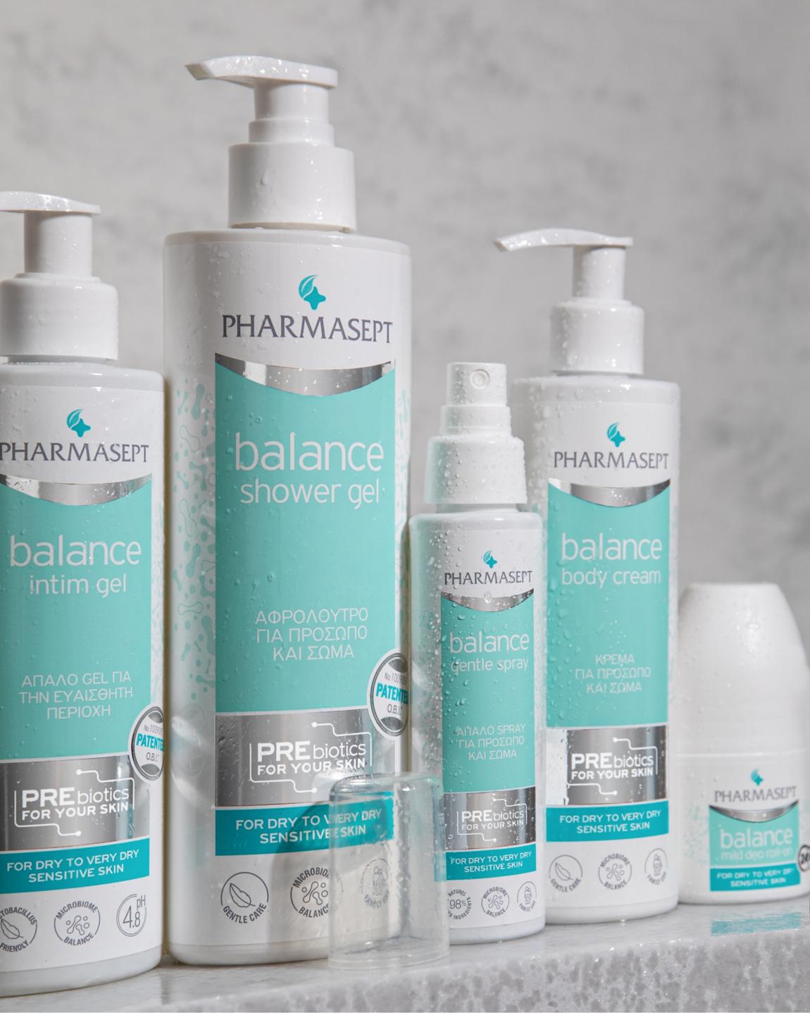 Με το βλέμμα στραμμένο στις σύγχρονες πολλαπλές απαιτήσεις της επιδερμίδας και στους παράγοντες που την επηρεάζουν (αυξημένη τάση δερματικών παθήσεων, κλιματική αλλαγή, χρήση λάθος προϊόντων κτλ.) η PHARMASEPT αναπτύσσει απαλές και ιδιαίτερα καινοτόμες συνθέσεις απαλλαγμένες από επιβαρυντικές για την επιδερμίδα ύλες. Καθώς το δέρμα αποτελεί το μεγαλύτερο όργανο στο ανθρώπινο σώμα, το μικροβίωμα συνθέτει το σύνολο των μικροβίων της μικροβιακής επιφάνειάς του. Γνωρίζοντας τη σημασία του μικροβιώματος και την αξία της ισορροπίας του, για υγιή και όμορφη επιδερμίδα, η νέα σειρά Balance, αξιοποιεί τη συνεισφορά των πρεβιοτικών και προβιοτικών στην προσπάθεια διατήρησης αυτής της ισορροπίας και απαντάει στις πολλαπλές ανάγκες των ξηρών έως πολύ ξηρών και ευαίσθητων επιδερμίδων, δημιουργώντας 5 προϊόντα που με επιστημονικά αποδεδειγμένο τρόπο, βασίζονται στη μοναδική «Τεχνολογία Εξισορρόπησης Δέρματος» της PHARMASEPT.