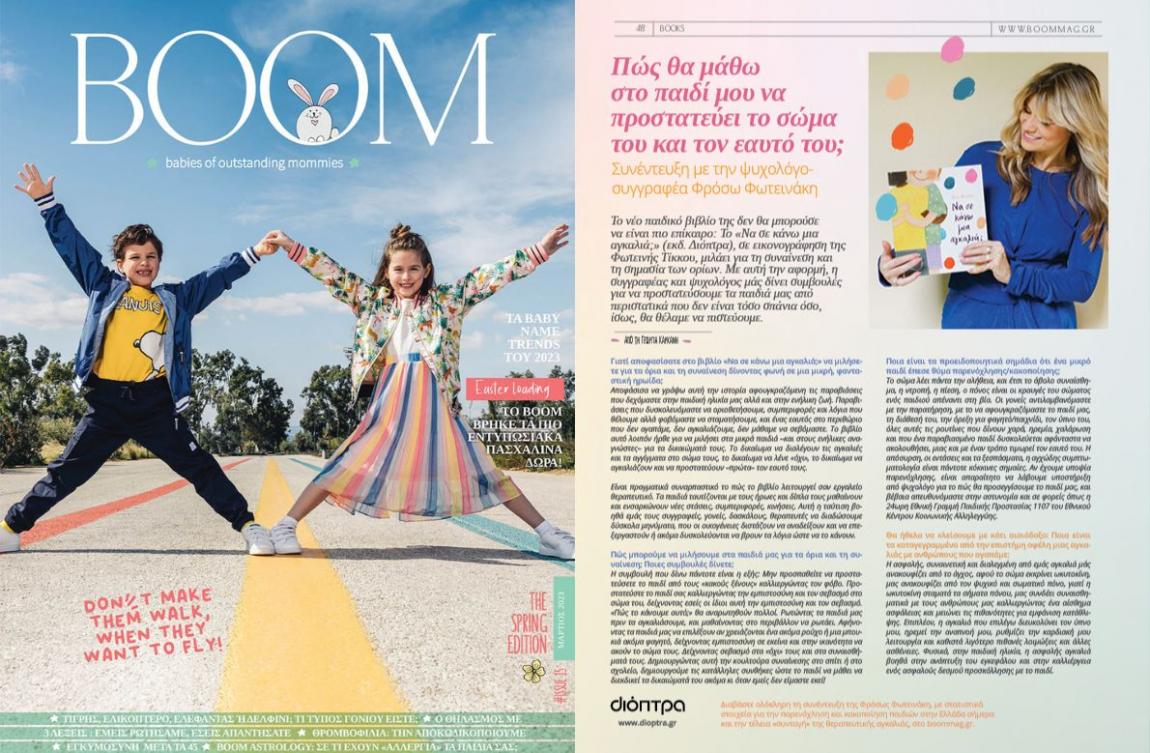 «Έμπνευσή μου για τις ιστορίες που δημιουργώ αποτελεί η καθημερινή επαφή μου με τους ανθρώπους που συναντώ στο γραφείο μου ως θεραπεύτρια αλλά και το δικό μου μεγάλωμα δίπλα στο μεγάλωμα των παιδιών μου, που τώρα πηγαίνουν στις πρώτες τάξεις του Δημοτικού. Αποφάσισα να γράψω αυτή την ιστορία για τα όρια αφουγκραζόμενη τις παραβιάσεις που δεχόμαστε στην παιδική ηλικία μας αλλά και στην ενήλικη ζωή. Παραβιάσεις που δυσκολευόμαστε να οριοθετήσουμε, συμπεριφορές και λόγια που θέλουμε αλλά φοβόμαστε να σταματήσουμε, και ένας εαυτός στο περιθώριο που δεν αγαπάμε, δεν αγκαλιάζουμε, δεν μάθαμε να σεβόμαστε. Το βιβλίο αυτό λοιπόν ήρθε για να μιλήσει στα μικρά παιδιά –και στους ενήλικες αναγνώστες– για τα δικαιώματά τους. Το δικαίωμα να διαλέγουν τις αγκαλιές και τα αγγίγματα στο σώμα τους, το δικαίωμα να λένε “όχι”, το δικαίωμα να αγκαλιάζουν και να προστατεύουν –πρώτα– τον εαυτό. Είναι πραγματικά συναρπαστικό το πώς το βιβλίο λειτουργεί σαν εργαλείο θεραπευτικό. Τα παιδιά ταυτίζονται με τους ήρωες και δίπλα τους μαθαίνουν και ενσαρκώνουν νέες στάσεις, συμπεριφορές, κινήσεις. Αυτή η ταύτιση βοηθά εμάς τους συγγραφείς, γονείς, δάσκαλους, θεραπευτές να διαδώσουμε δύσκολα μηνύματα, που οι οικογένειες διστάζουν να αναδείξουν και να επεξεργαστούν ή ακόμη δυσκολεύονται να βρουν τα λόγια ώστε να το κάνουν».