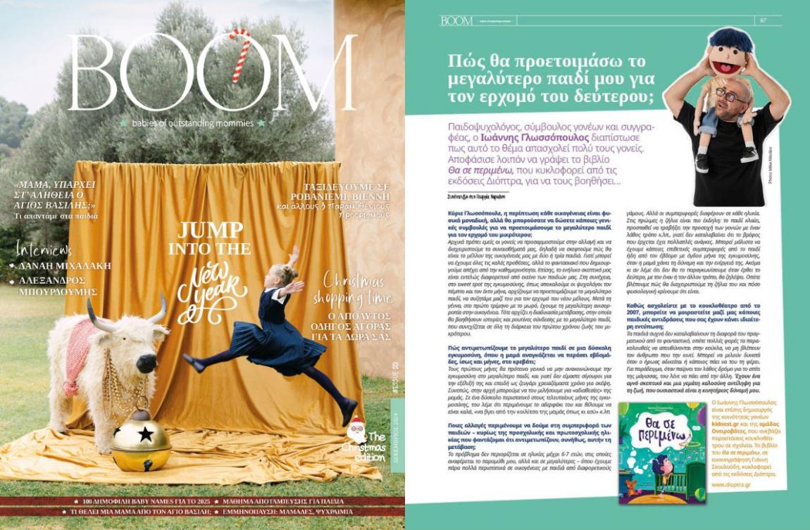 info: Ο Ιωάννης Γλωσσόπουλος είναι επίσης δημιουργός της κοινότητας γονέων kidnest.gr και της ομάδας Ονειροβάτες, που ανεβάζει παραστάσεις κουκλοθέατρου σε σχολεία. Το βιβλίο του Θα σε περιμένω, σε εικονογράφηση Γιάννη Σκουλούδη, κυκλοφορεί από τις εκδόσεις Διόπτρα (www.dioptra.gr)