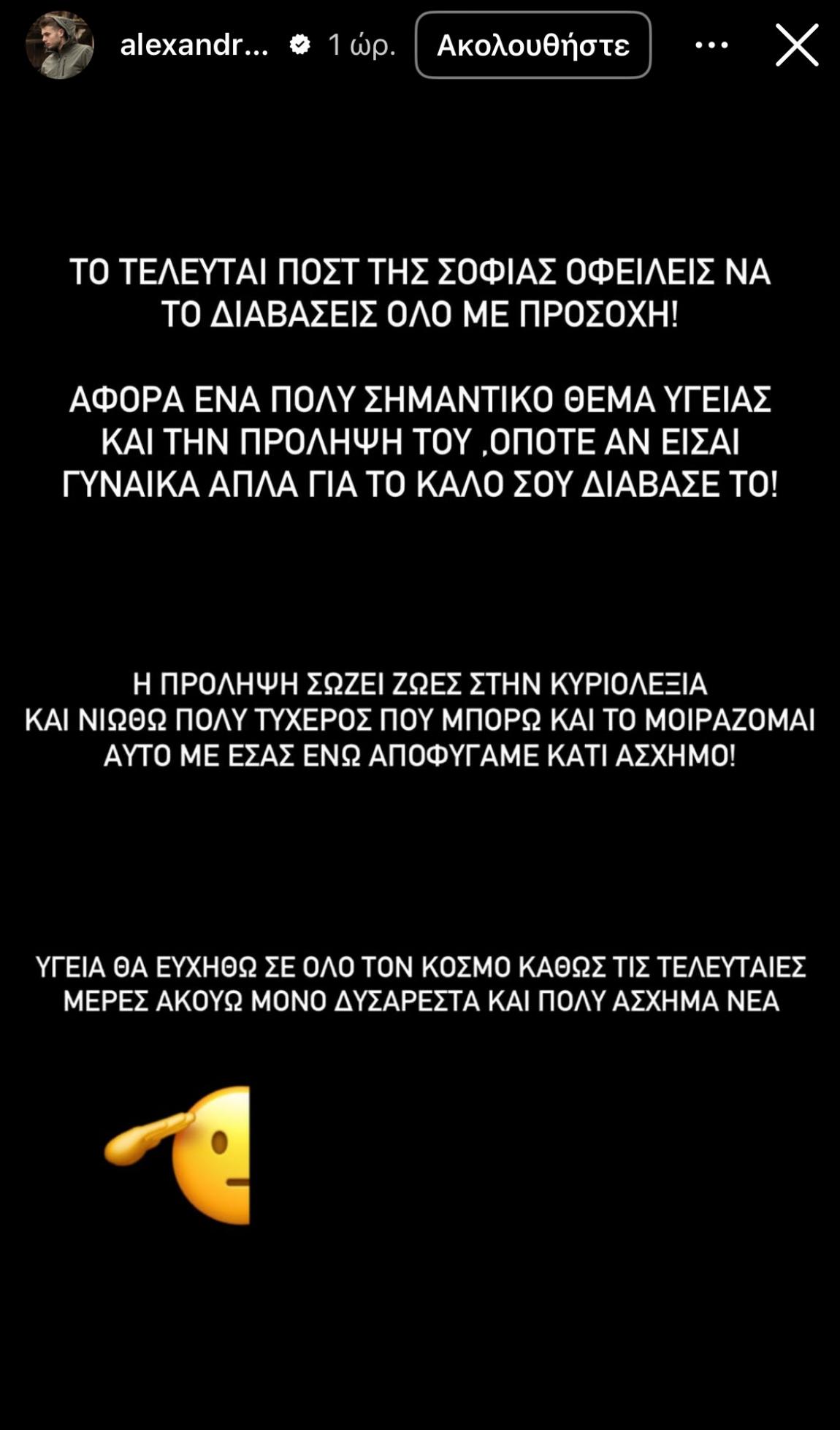 Λίγο αργότερα, ο Αλέξανδρος Κοψιάλης έκανε μια δημοσίευση στον προσωπικό του λογαριασμό στο Instgram, παρακινώντας όλες τις γυναίκες να διαβάσουν το post της συντρόφου και μητέρας του παιδιού του, τονίζοντας χαρακτηριστικά: «Η πρόληψη σώζει ζωές στην κυριολεξία».