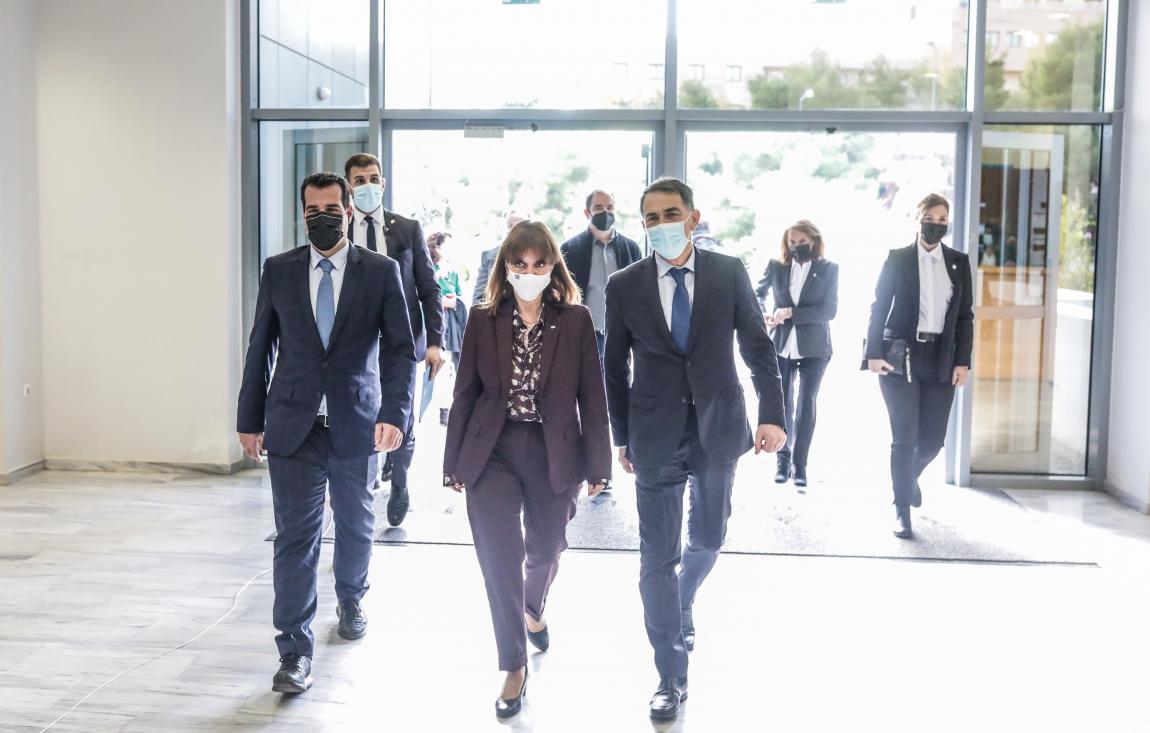Η Πρόεδρος της Δημοκρατίας Κ. Σακελλαροπούλου με τον υπουργό Υγείας Α. Πλεύρη (αριστερά) και τον Διοικητή του Νοσοκομείου ΑΤΤΙΚΟΝ Σ. Αποστολόπουλο (δεξιά)