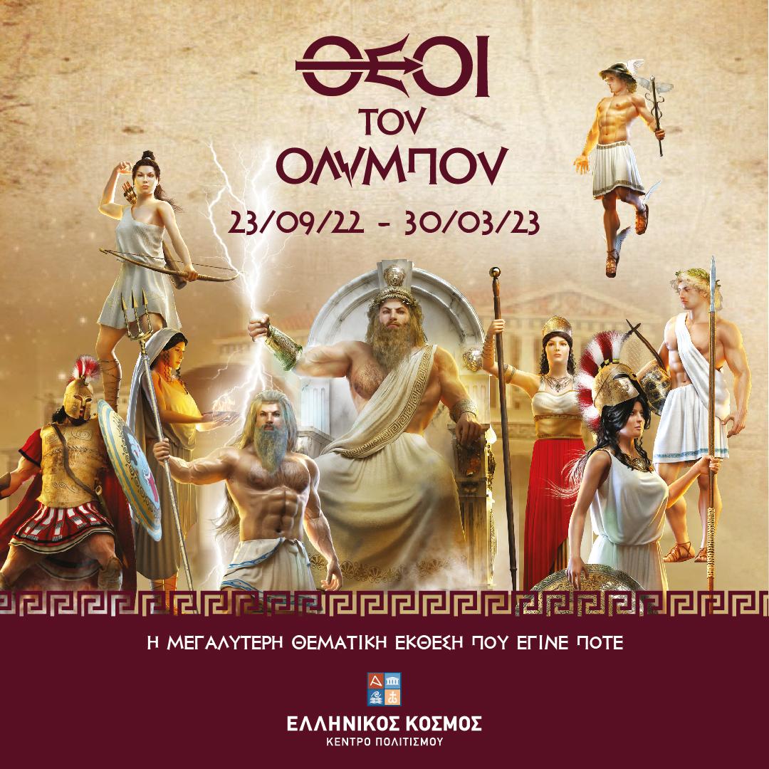 Σε έναν τεράστιο διαμορφωμένο χώρο στον Ελληνικό Κόσμο του Ιδρύματος Μείζονος Ελληνισμού 1.800τμ, η τεχνολογία συναντά τον μύθο: επιβλητικά εκθέματα, wall mapping, ξεναγήσεις, escape rooms, ολογράμματα, διαδραστικά acts ντύνουν τις ζωές και τα βιώματα των 12 Θεών του Ολύμπου και αποκαλύπτουν γνωστές και άγνωστες πτυχές του χαρακτήρα τους.