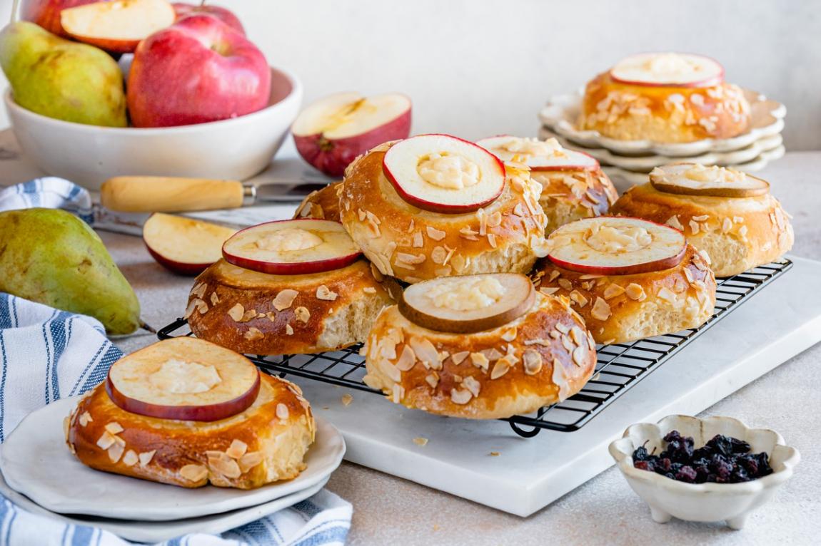 Για τη ζύμη: Ετοιμάζουμε τη ζύμη μας σύμφωνα με τις οδηγίες της συσκευασίας. Μετά και το δεύτερο φούσκωμα (6° βήμα στη συνταγή που αναγράφεται στη συσκευασία), χωρίζουμε τη ζύμη σε 10 κομμάτια και τα πλάθουμε απαλά σε σχήμα μπάλας. Τα τοποθετούμε με απόσταση μεταξύ τους –καθώς θα φουσκώσουν ξανά– σε ταψί στρωμένο με λαδόκολλα. Με τα δάχτυλά μας δημιουργούμε μια εσοχή στη μέση κάθε μπάλας και βάζουμε πάλι το ταψί στον προθερμασμένο φούρνο μέχρι τα κομμάτια να διπλασιαστούν σε όγκο. Βγάζουμε τα τσουρέκια από τον φούρνο, επαναλαμβάνουμε τη διαδικασία της εσοχής και στη μέση βάζουμε 1 κουταλιά της σούπας από την κρέμα μας. Τοποθετούμε από μία ροδέλα φρούτου, αλείφουμε με τον χτυπημένο κρόκο αυγού και πασπαλίζουμε με το φιλέ αμυγδάλου. Ψήνουμε σε προθερμασμένο φούρνο, στον αέρα, στους 150°C για 20-25 λεπτά. Αφήνουμε να κρυώσουν 5 λεπτά και σερβίρουμε!