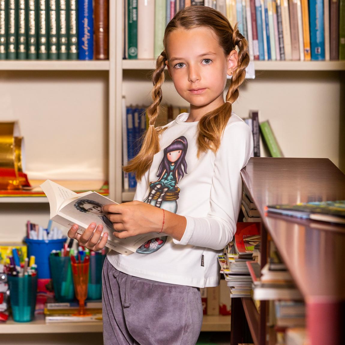Η Ραφαέλα με σετ από τη συλλογή ‘Five Star’, στέκα με φωτάκι που αναβοσβήνει και σχολική τσάντα ‘Santoro Gorjuss’.