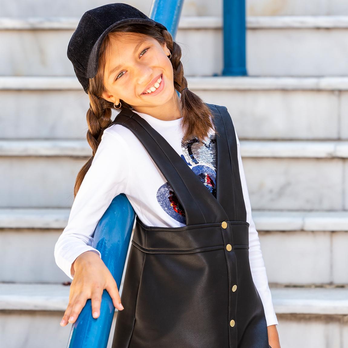 Άννα Μαρία: Φόρεμα – σαλοπέτα από οικολογικό δέρμα, λευκή μπλούζα με ασημένιες, μπλε και κόκκινες πούλιες και μαύρο κοτλέ μπερέ