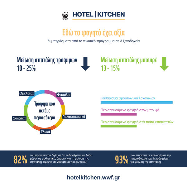 Mε στόχο τη μείωση της σπατάλης τροφίμων και τη συνετή αξιοποίηση κάθε πόρου που μας χαρίζει ο πλανήτης, το πρόγραμμα «Hotel Kitchen: Εδώ το φαγητό έχει αξία» εστιάζει στη μείωση του περιβαλλοντικού αποτυπώματος των ελληνικών ξενοδοχείων, μέσα από την καλύτερη διαχείριση των πρώτων υλών και τη δημιουργία μιας νέας φιλοσοφίας που αναδεικνύει την πραγματική αξία της τροφής. Στο επίκεντρο της πρωτοβουλίας του WWF, που υλοποιείται στην Ελλάδα με την υποστήριξη της Unilever Food Solutions, βρίσκονται οι επισκέπτες των ξενοδοχείων, αλλά και οι ίδιες οι επιχειρήσεις φιλοξενίας που καλούνται να γίνουν πρεσβευτές της αλλαγής.